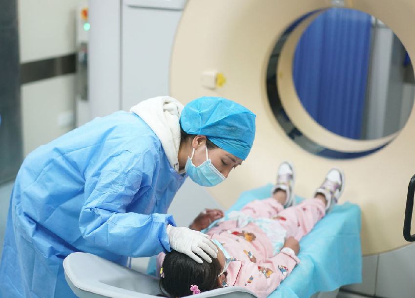 5月12日,南京醫(yī)科大學第二附屬醫(yī)院的護士在安慰準備接受CT增強檢查的小患者。新華每日電訊記者季春鵬攝