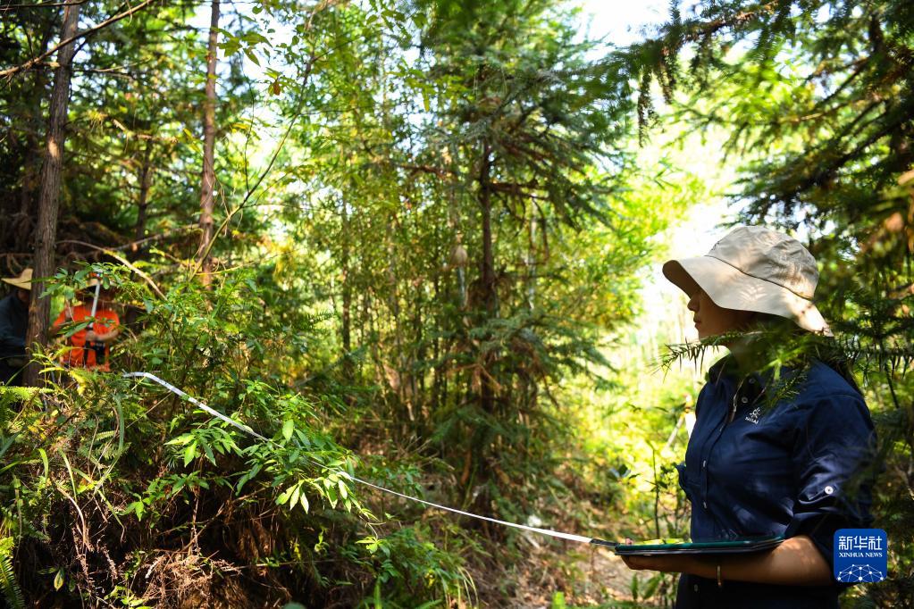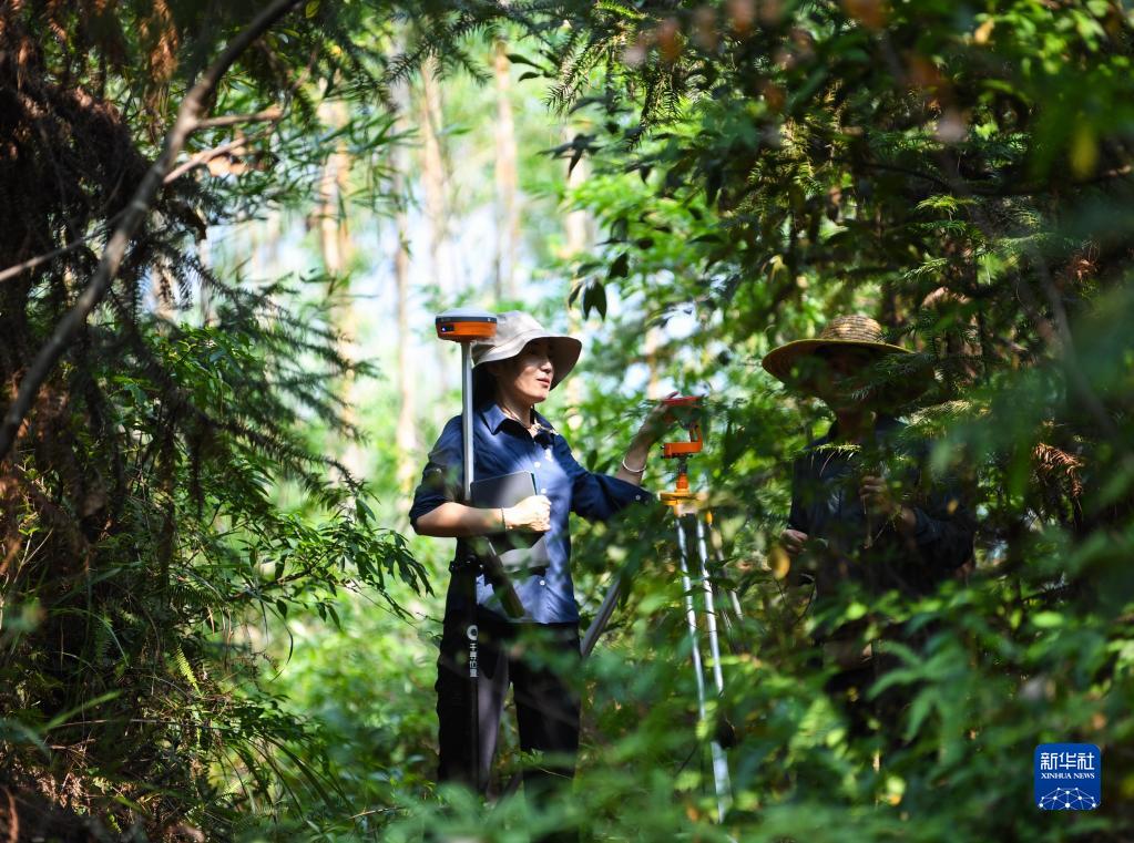 9月22日,白拉曲珍和同事在位于廣東韶關(guān)樂(lè)昌市張溪村的生態(tài)監(jiān)測(cè)樣地工作。新華社記者 鄧華 攝