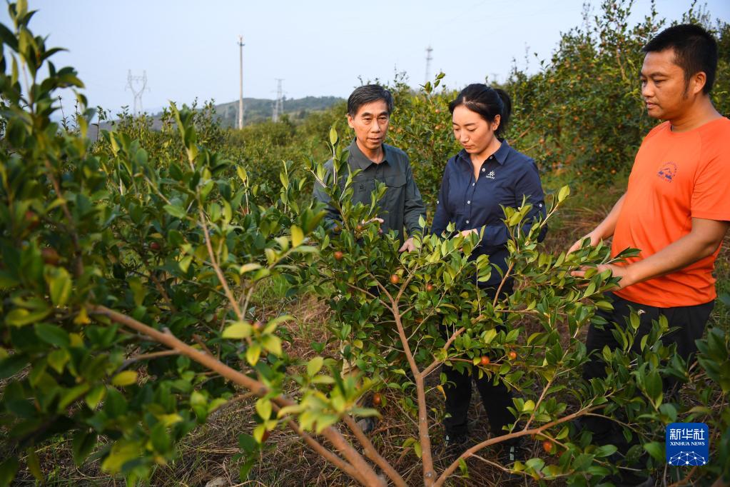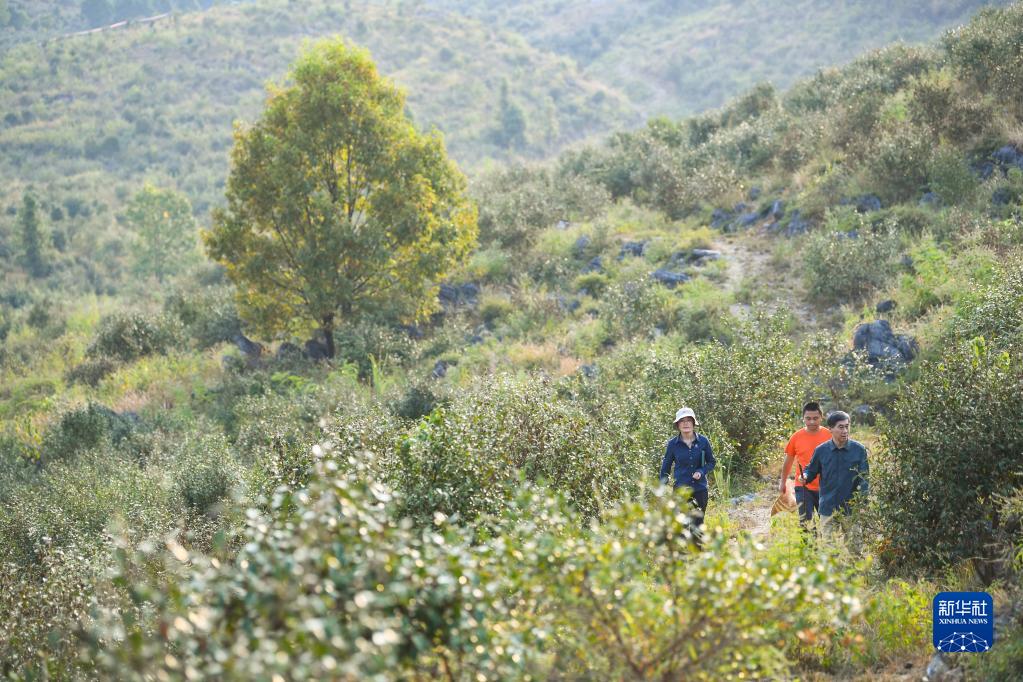 9月21日,在廣東韶關(guān)樂(lè)昌市梅花鎮(zhèn)流山村,白拉曲珍(左)和師傅江建發(fā)(右)、同事伍國(guó)清來(lái)到石漠化綜合治理的油茶種植基地查看油茶生長(zhǎng)情況。新華社記者 鄧華 攝
