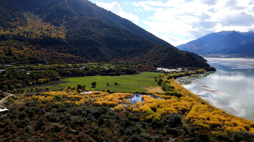 進(jìn)入深秋,西藏多地已飄下皚皚白雪,米林則依然保持著“雪域江南”的底色,在低海拔地區(qū)甚至還可以找到盛開的小花;往上,就是秋的顏色,豐茂的樹林鑲嵌著縷縷金黃,漸次更替;再往上,越來越多的山頂開始戴上“白色的帽子”,這是雪域高原的本色。春夏秋冬好像都在這個季節(jié)相遇。