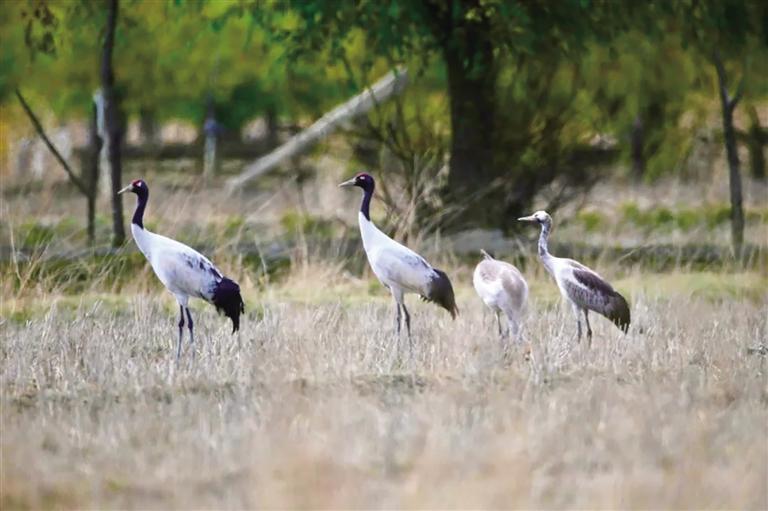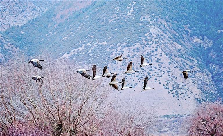 黑頸鶴是世界上唯一生長、繁殖在高原的鶴類,通?;顒佑诤0?000米以上的開闊農(nóng)田、河谷和濕地,屬國家一級保護(hù)動物,林芝是黑頸鶴的重要棲息地之一。據(jù)北京林業(yè)大學(xué)郭玉民教授團(tuán)隊跟蹤監(jiān)測,10月30日以來,今年首批黑頸鶴順利從青海湖附近繁殖地返回林芝越冬地,遷徙直線距離超過1100公里。