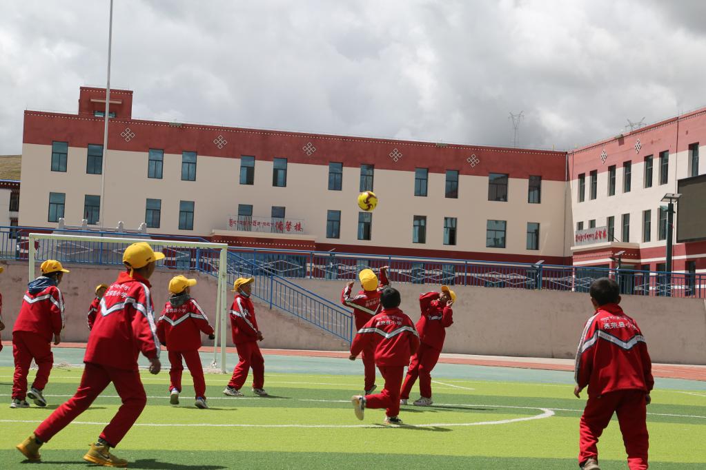 那曲聶榮縣小學的學生們正在踢足球(4月20日攝)