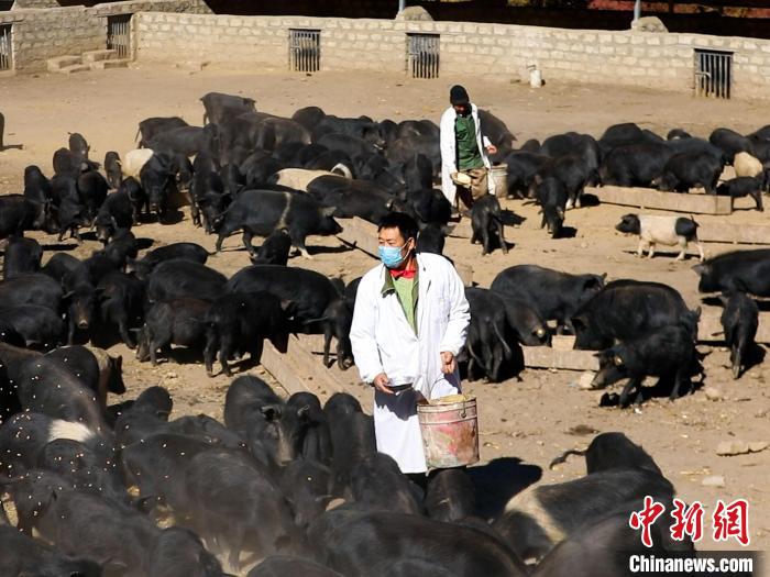 圖為飼養(yǎng)員正在給藏香豬喂食。土旦曲扎 攝