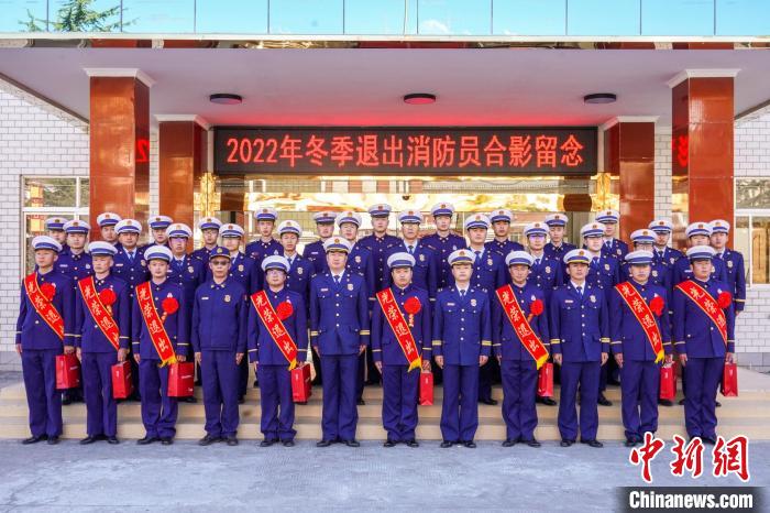 圖為退出消防員合影留念?!±顕?guó)燾 攝