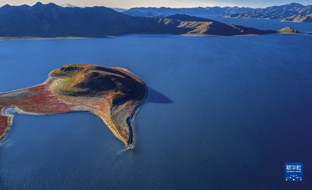 這是夕陽(yáng)下的羊卓雍錯(cuò)(12月11日攝,無人機(jī)照片)。新華社記者 姜帆 攝
