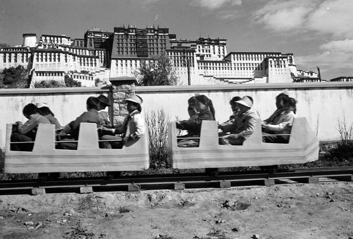 1987年10月1日,在拉薩勞動(dòng)人民文化宮內(nèi)新建成一座大型游樂場(chǎng)里,小朋友們?cè)诔俗妱?dòng)小火車。