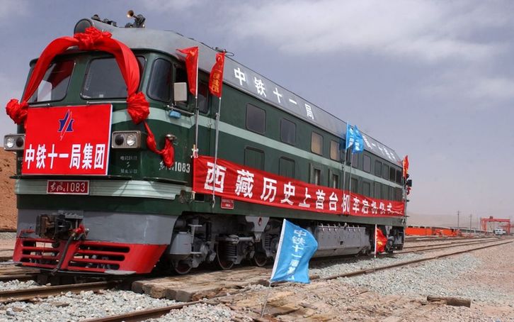 2004年3月23日,在海拔4704米的青藏鐵路海拔最高鋪架基地——西藏安多鋪架基地上,中鐵十一局1083號(hào)東風(fēng)4型內(nèi)燃機(jī)車向雪域高原緩緩駛來。這標(biāo)志著西藏歷史上出現(xiàn)了第一臺(tái)鐵路機(jī)車。