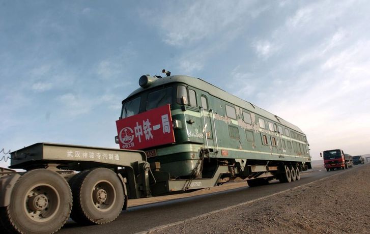 2005年4月19日,一輛汽車上裝著一輛機(jī)車,從青海省格爾木市秀水河車站經(jīng)過青藏公路向西藏安多方向行駛。青藏鐵路建設(shè)總指揮部從2004年3月開始陸續(xù)把近200臺(tái)機(jī)車、鋪軌機(jī)、架橋機(jī)、軌道車等大型鋪架設(shè)備用汽車從格爾木安全運(yùn)抵西藏安多,途中翻越海拔5231米的唐古拉山埡口,創(chuàng)造了鐵路建設(shè)史上的奇跡。