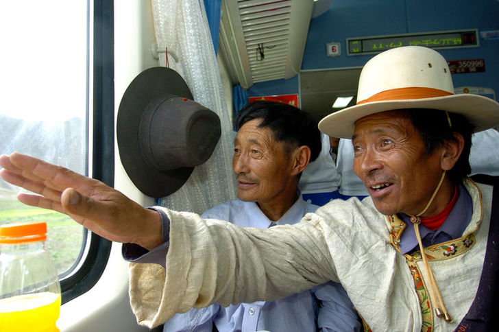 2006年7月1日,烏金(右一)在“藏2”次列車經(jīng)過自己家鄉(xiāng)安多時(shí),興奮地指向車外,向同伴介紹。