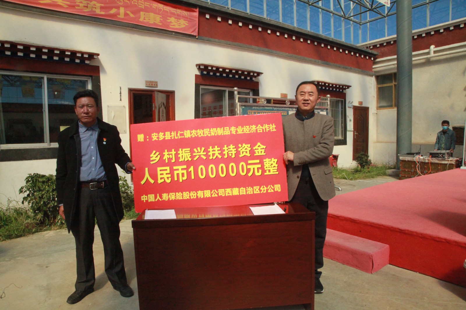 圖為中國人壽西藏分公司向那曲市安多縣扎仁鎮(zhèn)納色社區(qū)捐贈(zèng)產(chǎn)業(yè)扶持資金10萬元。