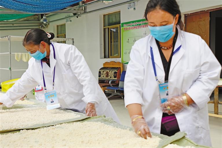 圖為聶榮縣色慶鄉(xiāng)雜瑪多種經(jīng)營(yíng)合作社工作人員對(duì)奶渣進(jìn)行干燥處理。 記者 萬靖 謝偉 攝