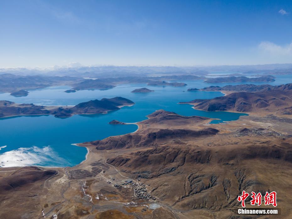 近日,西藏自治區(qū)山南市羊卓雍錯(cuò)(簡(jiǎn)稱羊湖),冬日由于沒(méi)有云層遮擋,湖水更顯深藍(lán)、孔雀藍(lán)。航拍視角下,湖水像巨大的寶石鑲嵌于高原大地,風(fēng)光壯麗。羊卓雍錯(cuò)藏語(yǔ)意為“碧玉湖”,湖面海拔4441米,與納木錯(cuò)、瑪旁雍錯(cuò)并稱西藏三大“圣湖”。圖為航拍冬日羊卓雍錯(cuò)。 江飛波 攝