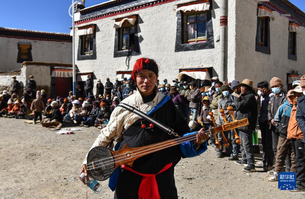 在西藏日喀則市芒普鄉(xiāng)普村的“村晚”現(xiàn)場,演員手持扎念琴準(zhǔn)備表演傳統(tǒng)節(jié)目(1月21日攝)。新華社記者 晉美多吉 攝