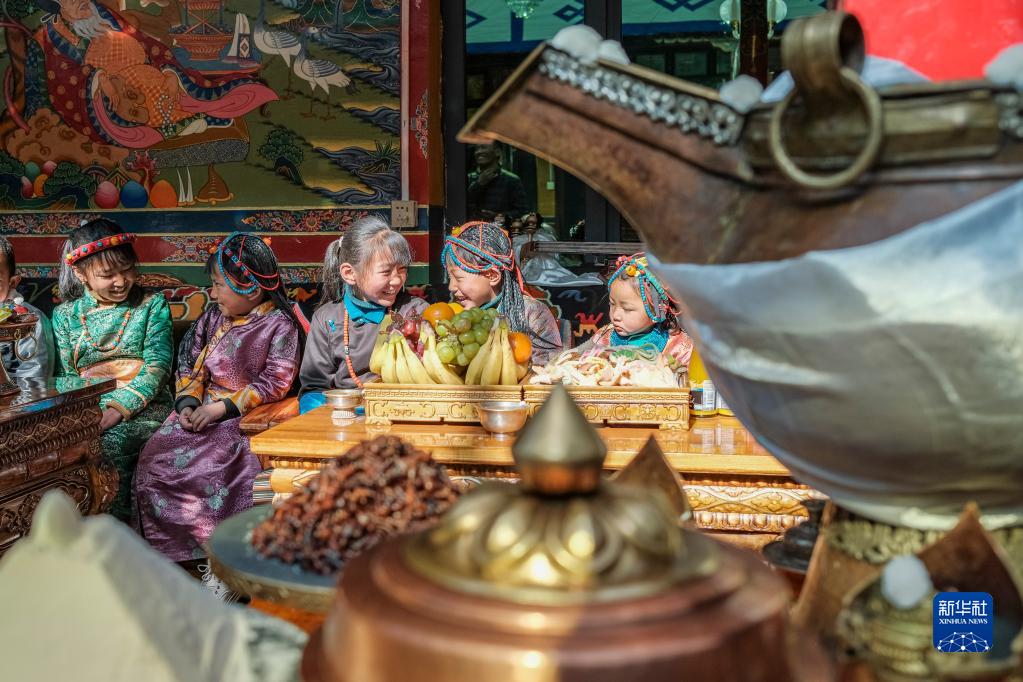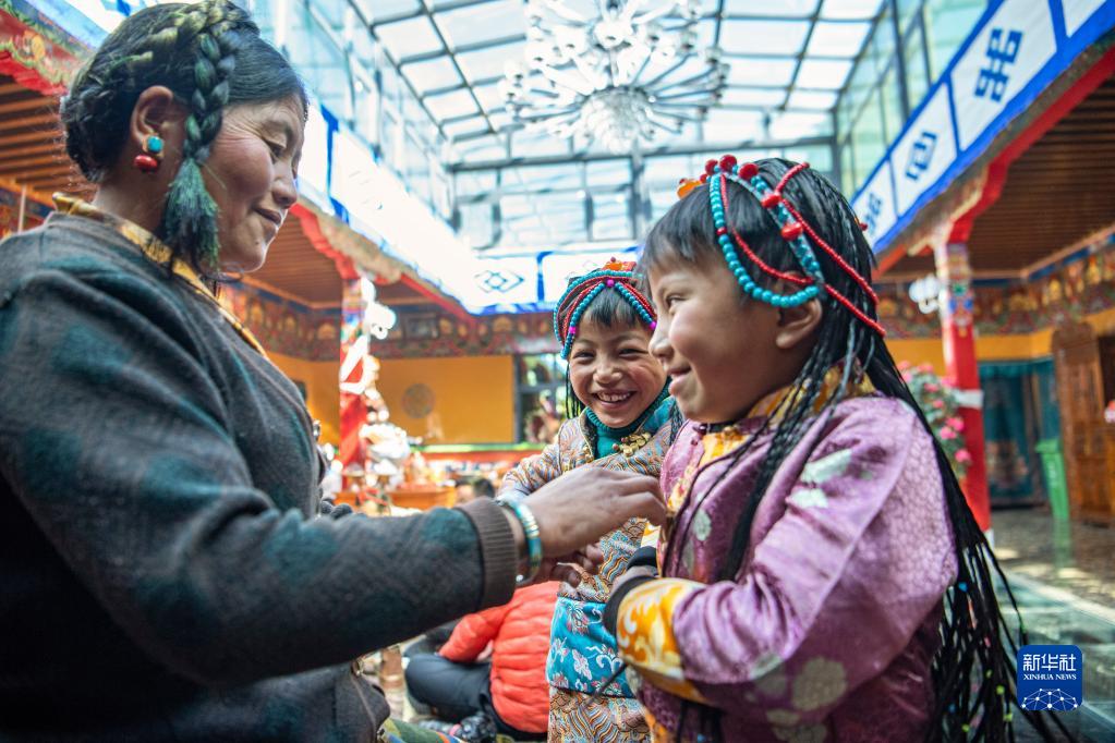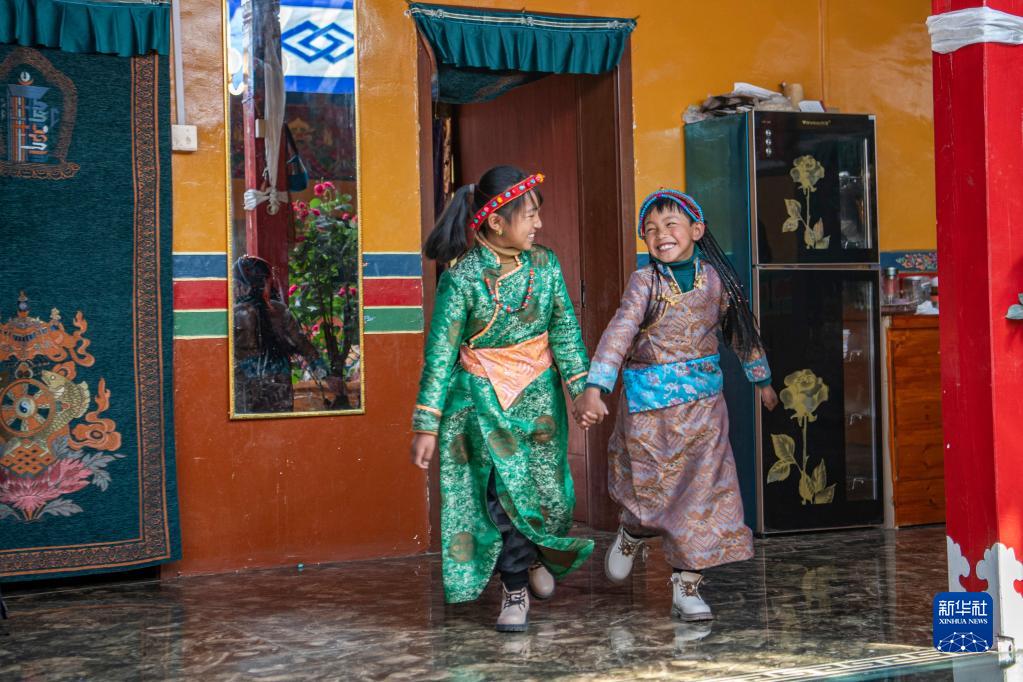 今年,日喀則藏歷農(nóng)家年和春節(jié)“巧遇”同一天,雖習(xí)俗不同,但年味皆濃。次旦的兒孫早早開(kāi)車去縣城采買了年貨,兒媳婦們?cè)诩覝?zhǔn)備過(guò)年吃的羊頭、切瑪?shù)葌鹘y(tǒng)特色美食。家中的第四代,次旦老人的重孫子和重孫女們,則穿上了漂亮的藏裝,頭戴綠松石點(diǎn)綴的頭飾,在家中歡快地跑來(lái)跑去。