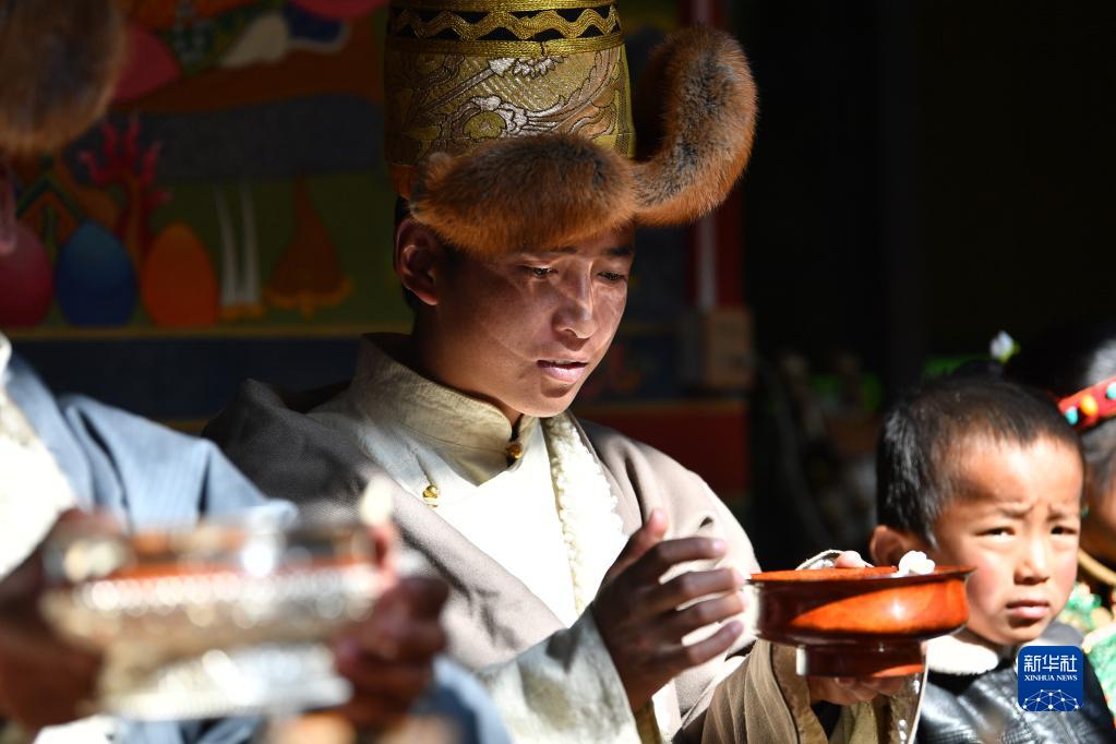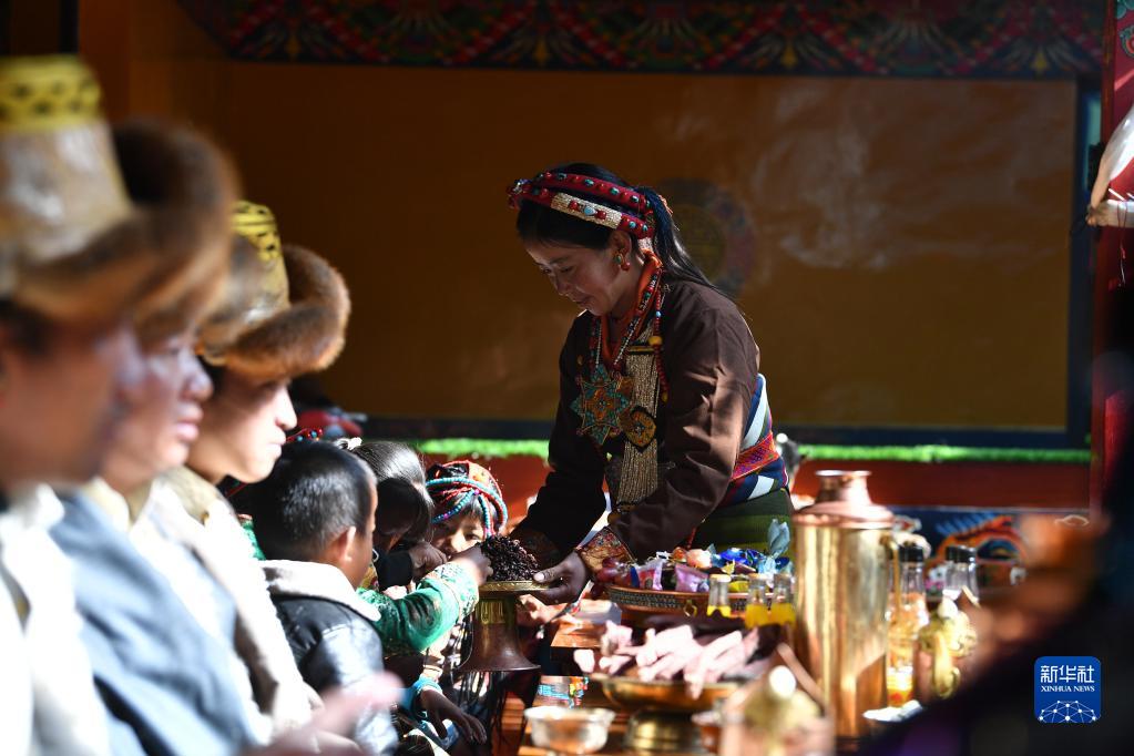 次旦老人接過(guò)孫女敬獻(xiàn)的切瑪(1月22日攝)。新華社記者 晉美多吉 攝