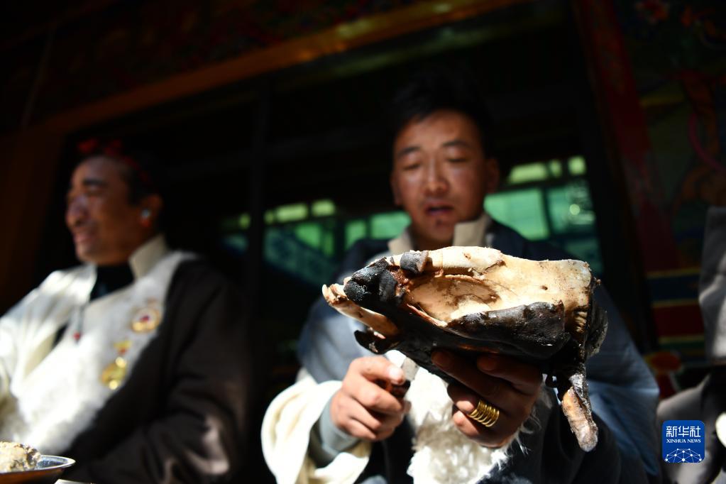次旦老人孫子在吃過(guò)年必吃的傳統(tǒng)特色美食羊頭(1月22日攝)。新華社記者 晉美多吉 攝