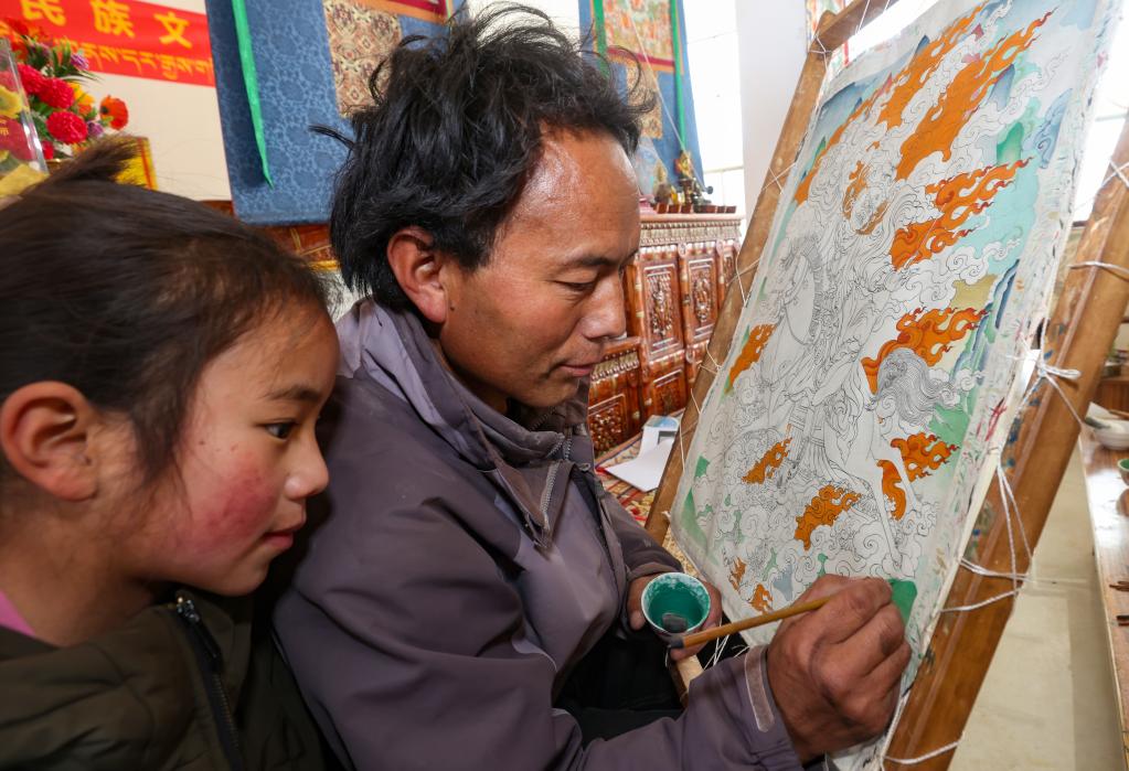 嘎桑堅(jiān)參所在的堤無(wú)瑪藝術(shù)傳承專業(yè)合作社由桑珠榮亞中村村民、西藏一級(jí)唐卡畫師西繞尼瑪創(chuàng)立。據(jù)介紹,目前合作社有25名員工,員工日工資最高超過(guò)200元。