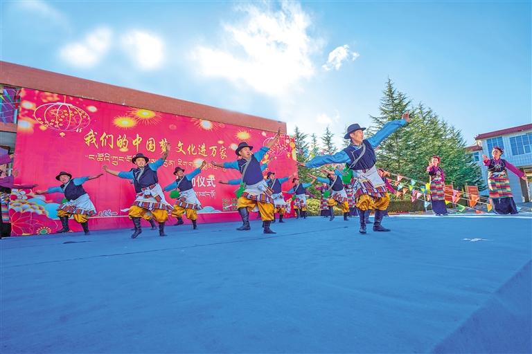 西藏自治區(qū)歌舞團(tuán)演員們表演精彩的舞蹈節(jié)目。通訊員 張啟 記者 格桑倫珠 攝