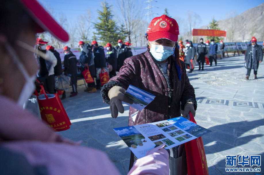 2月2日,拉薩市拉魯濕地國(guó)家級(jí)自然保護(hù)區(qū)管理局工作人員向群眾發(fā)放濕地保護(hù)宣傳單。新華網(wǎng) 旦增努布攝