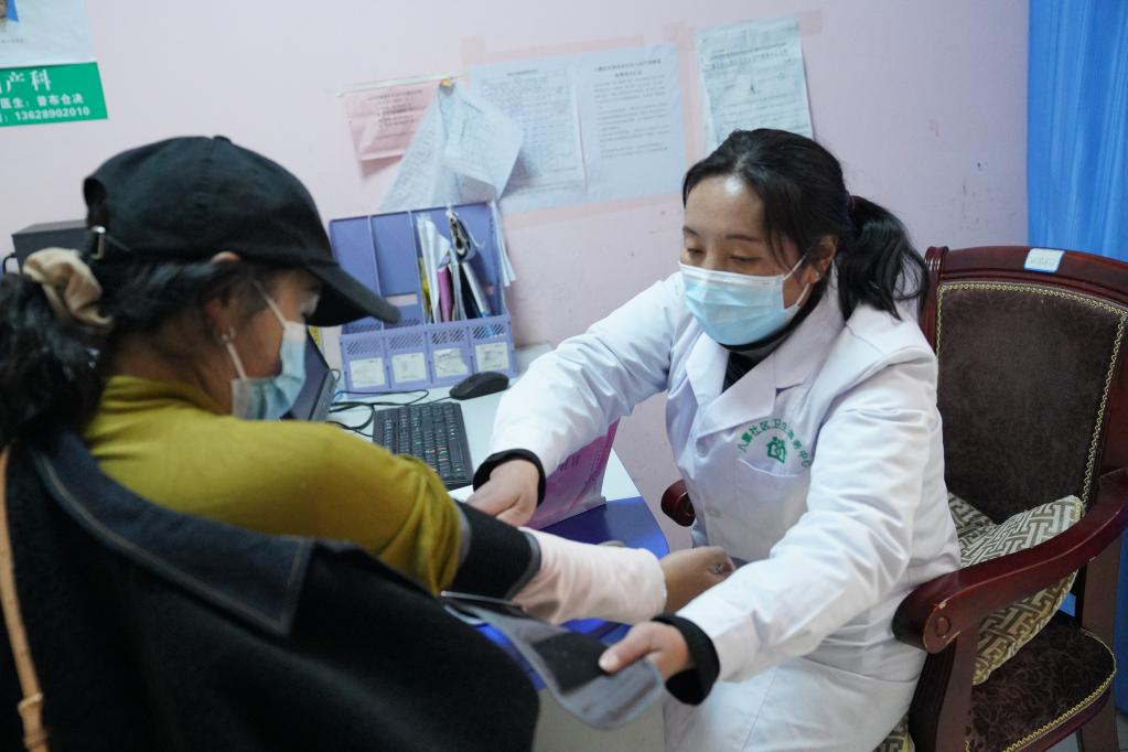 拉薩市八廓街道社區(qū)衛(wèi)生服務(wù)中心的醫(yī)生(右)在為群眾做檢查。新華社記者黃耀漫 攝