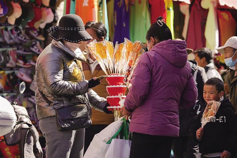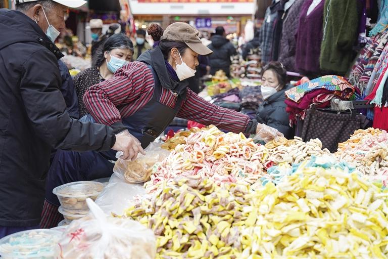 “市場現(xiàn)有1200多家商戶,經(jīng)營商品有零食、蔬菜、肉類、干雜、五金、服裝等。藏歷新年臨近,每天前來置辦年貨的市民絡(luò)繹不絕,日均人流量超1萬。為保證藏歷新年期間年貨充足,市場商戶們提前籌備、積極備貨,目前,各類商品庫存充足、品種豐富,基本上能夠滿足不同消費者的需求?!睕_賽康商貿(mào)有限公司負(fù)責(zé)人尼瑪告訴記者。此外,沖賽康市場將于2月19日至27日暫停營業(yè),28日起正常營業(yè)。