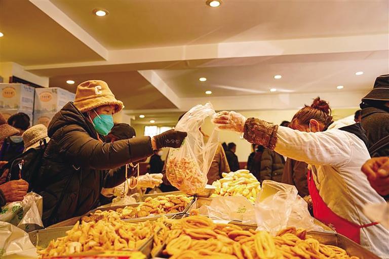 不遠處,尼珍藏式卡塞店的店員們正忙著制作“卡塞”,揉面、切割、染色,面片經店員們的巧手捏成長條形、圓形、蝴蝶形等不同樣式,最后放到油鍋炸至金黃,出鍋后瀝油再撒上白糖,香甜可口、樣式精美的卡塞就制作完成了。新鮮出爐的卡塞顏色金黃、香氣四散開來,市民們爭相選購?!拔覀冏隹ㄈ呀?5年了,今年1月10日開門營業(yè),很多老顧客就來光顧了,每天收入在2000元至3000元之間,而且我們選用的原材料比較好,再加上現場制作、新鮮銷售,生意好的時候賣得更多。”老板尼珍告訴記者:“我們店制作的卡塞價格實惠,連續(xù)8年沒有漲價,每斤30元,今年準備營業(yè)到藏歷十二月二十九(公歷2月19日)歇業(yè)?!?/p>