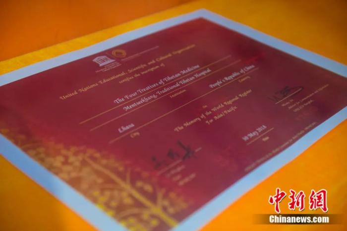 藏醫(yī)著作《四部醫(yī)典》入選《世界記憶亞太地區(qū)名錄》證書。貢嘎來松 攝