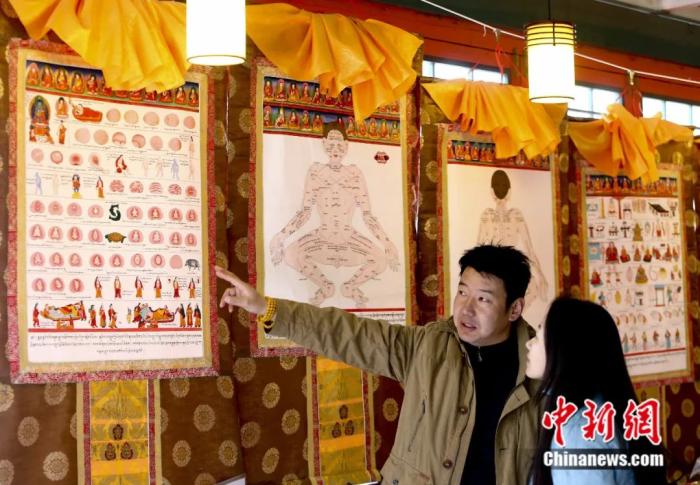烏克蘭游客在西藏藏醫(yī)院觀看由藏醫(yī)藥經(jīng)典著作《四部醫(yī)典》而繪制的彩色掛圖。 何蓬磊 攝