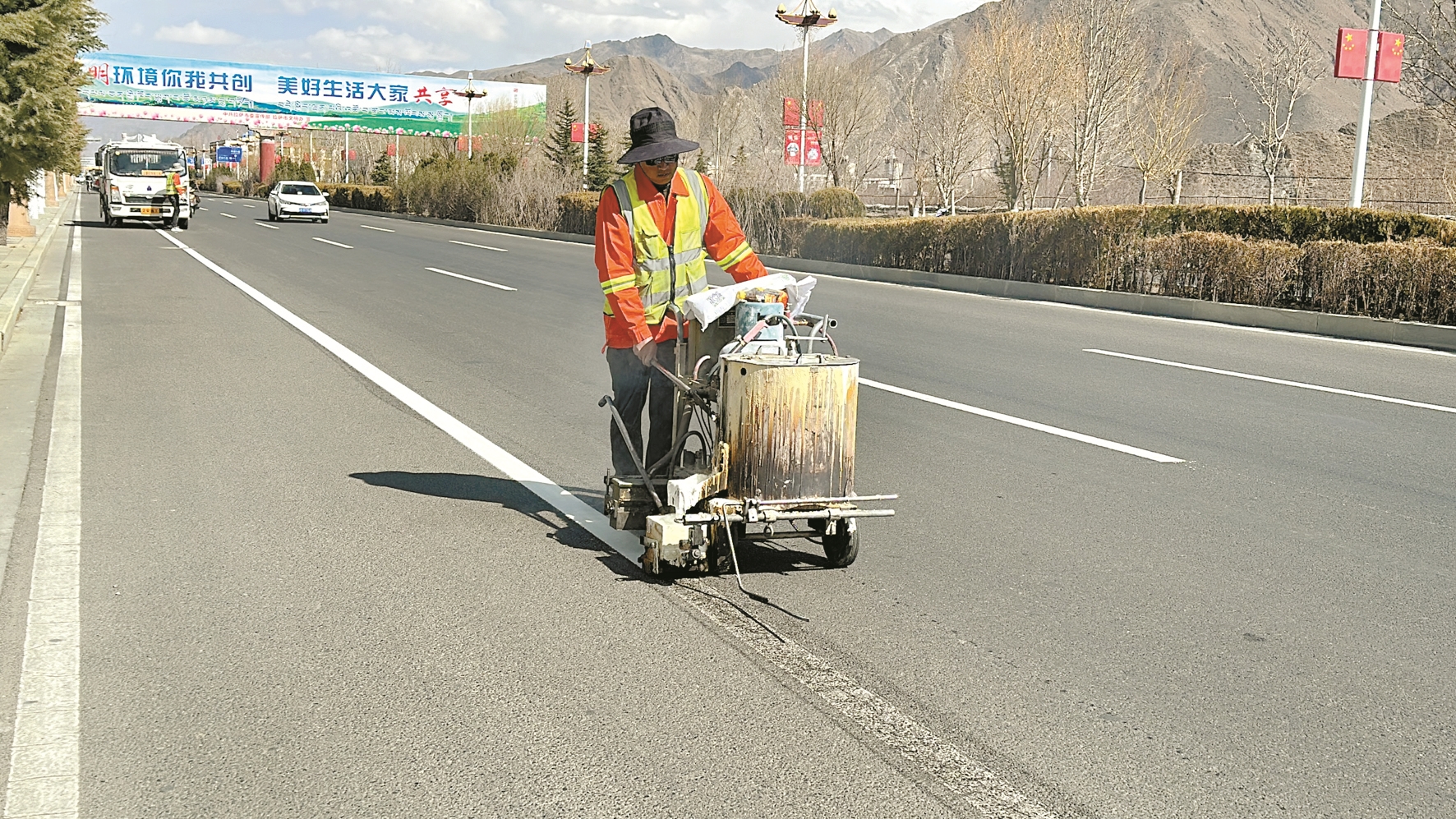 圖為工作人員正在南環(huán)318沿線(xiàn)施劃交通標(biāo)線(xiàn)。 拉薩融媒記者 左曉萌攝