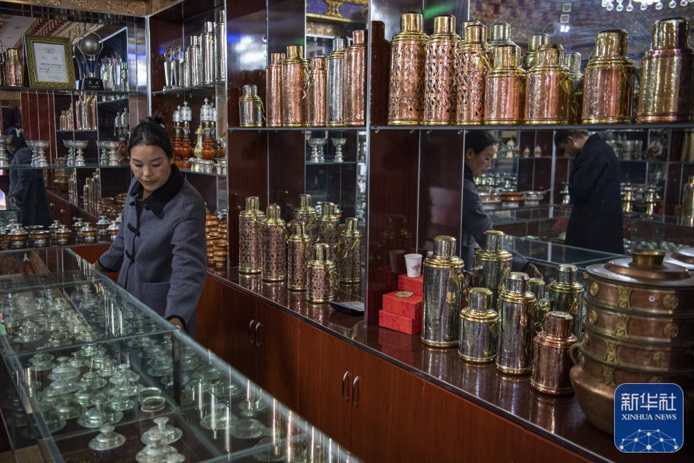 這是扎西吉彩金銀銅器廠的產(chǎn)品展示間(3月9日攝)。