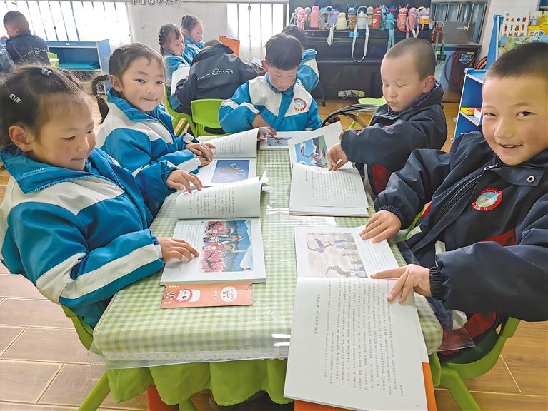 圖為孩子們興致勃勃地閱讀獲贈(zèng)的書(shū)籍。