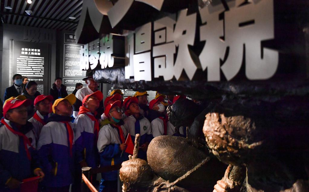 與此同時,西藏百萬農奴解放紀念館也迎來了不少市民、中小學生和游客。這座占地2700平方米的展館里,陳列著反映舊西藏苛捐雜稅的雕像,再現舊西藏農奴被囚禁虐待的情景。
