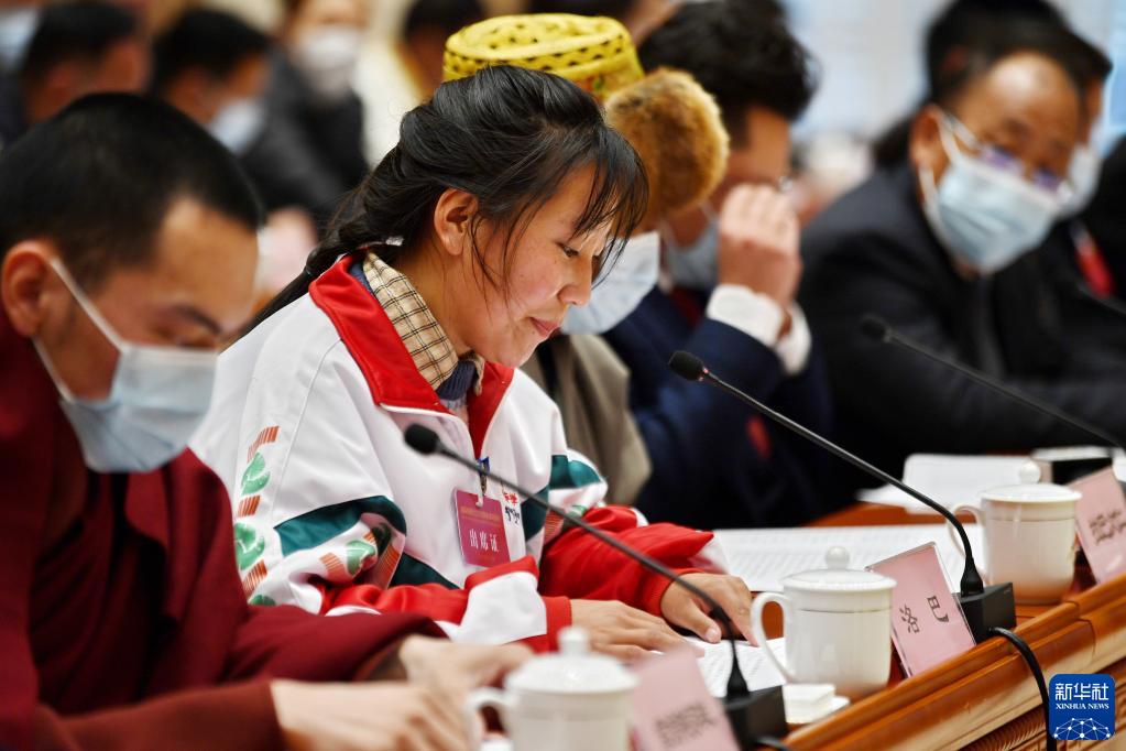 3月28日,拉薩中學(xué)高二學(xué)生洛巴(左二)參加慶祝西藏百萬農(nóng)奴解放64周年座談會時發(fā)言。新華社記者 張汝鋒 攝