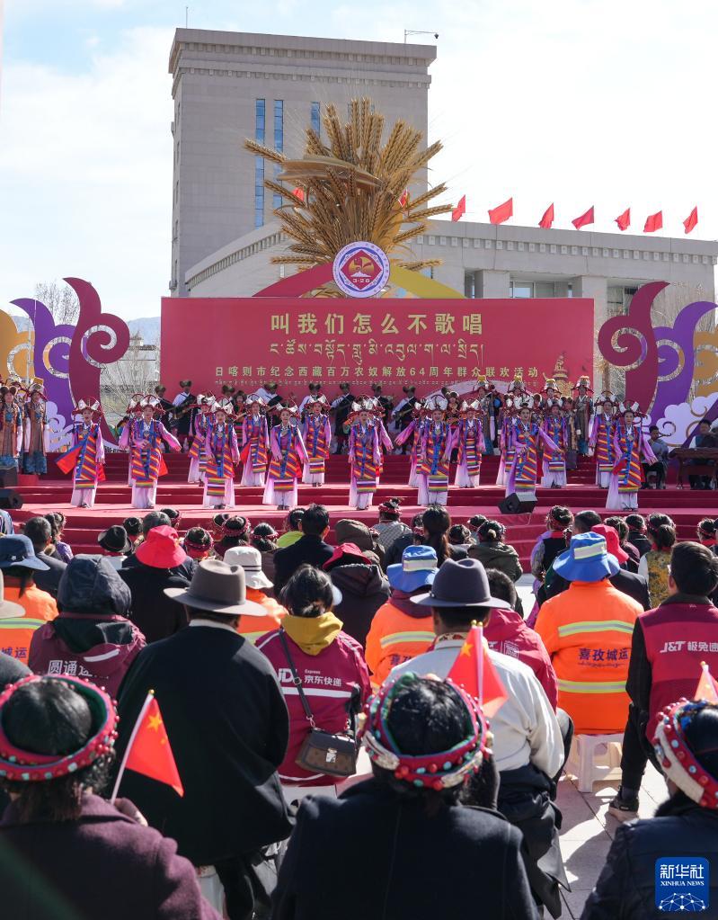 這是3月28日拍攝的日喀則市紀(jì)念西藏百萬農(nóng)奴解放64周年群眾聯(lián)歡活動現(xiàn)場。新華社發(fā)(何金龍 攝)