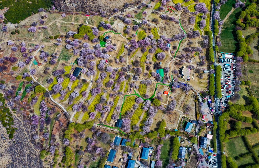 鳥(niǎo)瞰桃花盛開(kāi)的嘎拉村,停滿了旅游車(chē)輛(無(wú)人機(jī)照片,3月24日攝)。新華社記者 姜帆 攝