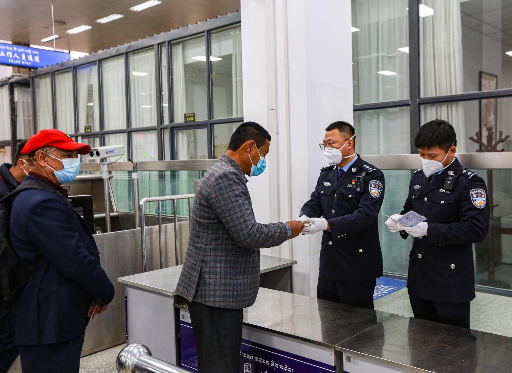 4月1日,移民管理警察在吉隆口岸驗(yàn)放入境旅客。新華社發(fā)(肖富貴 攝)