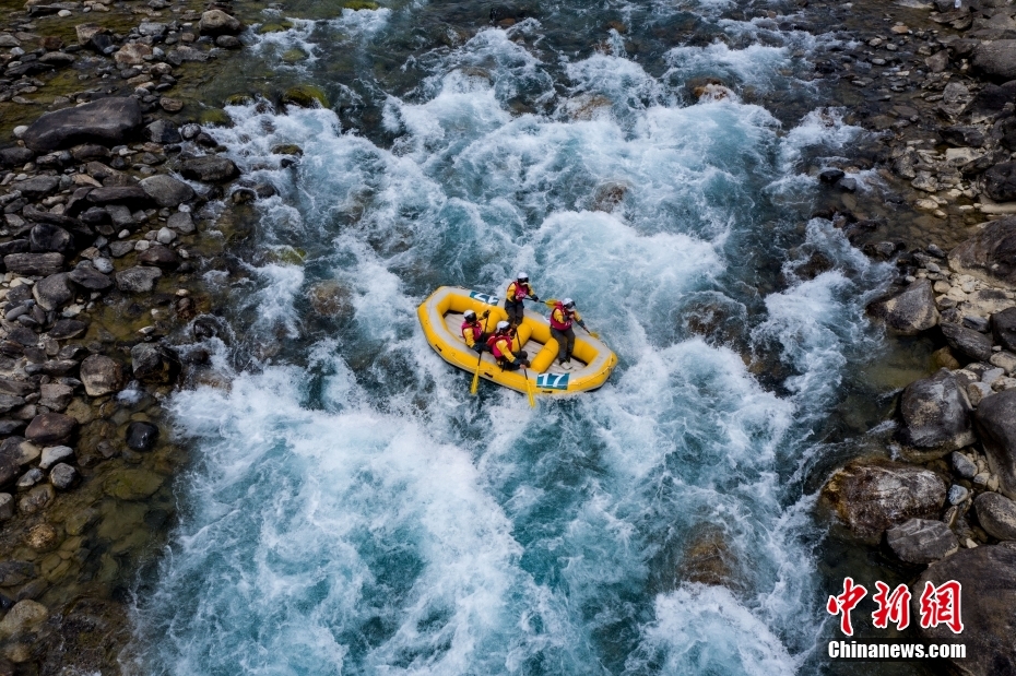 圖為激流漂流筏追逐賽比賽現(xiàn)場(chǎng)。(無(wú)人機(jī)照片)中新社記者 貢嘎來(lái)松 攝