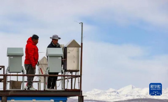 達(dá)瓦扎西(右)和同事扎西平措一起在檢查觀測儀器(4月13日攝)。新華社記者 姜帆 攝