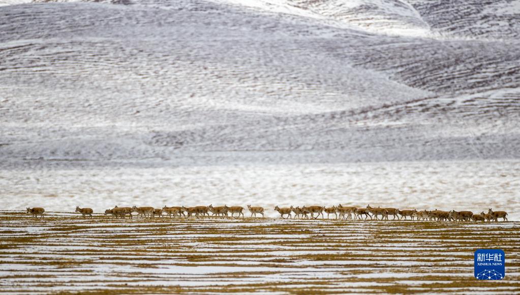 這是在羌塘國家級(jí)自然保護(hù)區(qū)那曲市雙湖縣區(qū)域內(nèi)拍攝到的藏羚羊群(4月17日攝) 。新華社記者 姜帆 攝