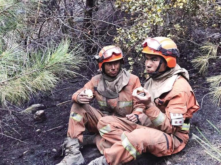 參與滅火任務后正在休息的陳子明(右)。圖片由林芝市森林消防支隊提供