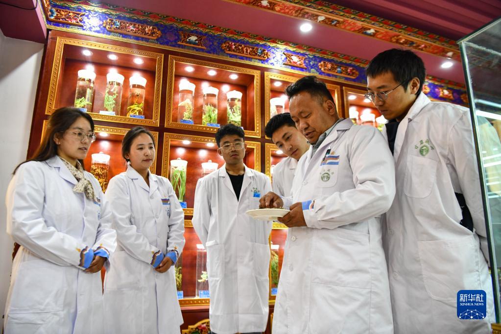 在藏藥材標(biāo)本室,普窮次仁為學(xué)生講解藏藥材知識(4月20日攝)。新華社記者 晉美多吉 攝