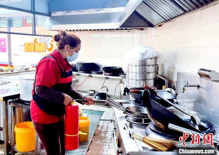 模擬廚房發(fā)生火災(zāi),員工發(fā)現(xiàn)火源后,立即關(guān)閉燃?xì)忾y,拉閘斷電,第一時(shí)間利用周邊滅火器進(jìn)行初期火災(zāi)撲救?!㈣?攝