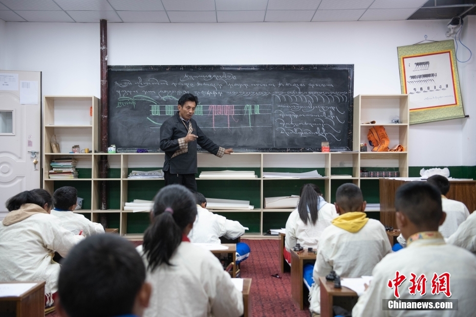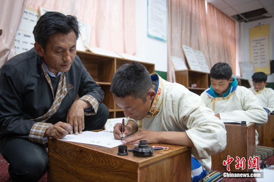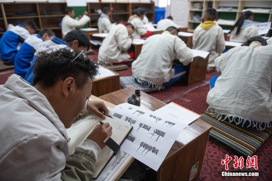 5月7日,西藏山南市,加查縣中學(xué)藏文書法興趣班的教師扎西達(dá)瓦給學(xué)生們上課。該興趣班由2名藏文教師任教,每周兩課時,利用自習(xí)課或晚自習(xí)時間為學(xué)生和教師授課。課程內(nèi)容包含執(zhí)筆、運筆、姿勢等基礎(chǔ)書寫技能,以及藏文中的烏金體、珠擦體、簇仁體、簇通體等各類字體的書寫方法。