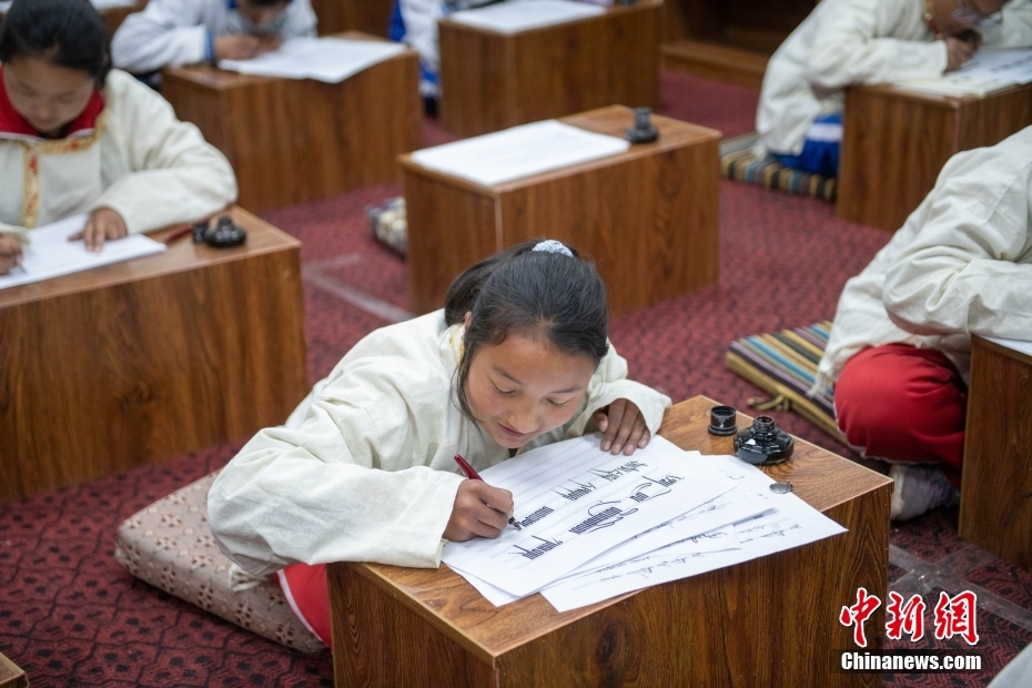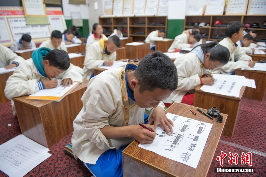 5月7日,西藏山南市,加查縣中學(xué)學(xué)生在上藏文書法興趣班。該興趣班由2名藏文教師任教,每周兩課時,利用自習(xí)課或晚自習(xí)時間為學(xué)生和教師授課。課程內(nèi)容包含執(zhí)筆、運筆、姿勢等基礎(chǔ)書寫技能,以及藏文中的烏金體、珠擦體、簇仁體、簇通體等各類字體的書寫方法。