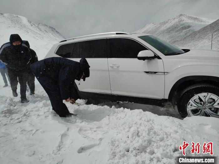 “看見你們過來,懸在我們所有人心里的石頭就落地了?!苯泳粋€多小時后,民警終于在海拔5800米的相拉山口處發(fā)現(xiàn)5輛被困車輛。根據(jù)現(xiàn)場情況,民警決定采用掘進方式,為車輛清理出一條道路?!按蠡飪簛泶畎咽郑硕嗔α看?!”被困民眾配合民警使用鐵鍬將最前面車輛周圍積雪鏟除,嘗試將車輛推出積雪路段。但因車輛自重、積雪太厚,救援人員無法推動車輛前移,第一次救援以失敗告終。