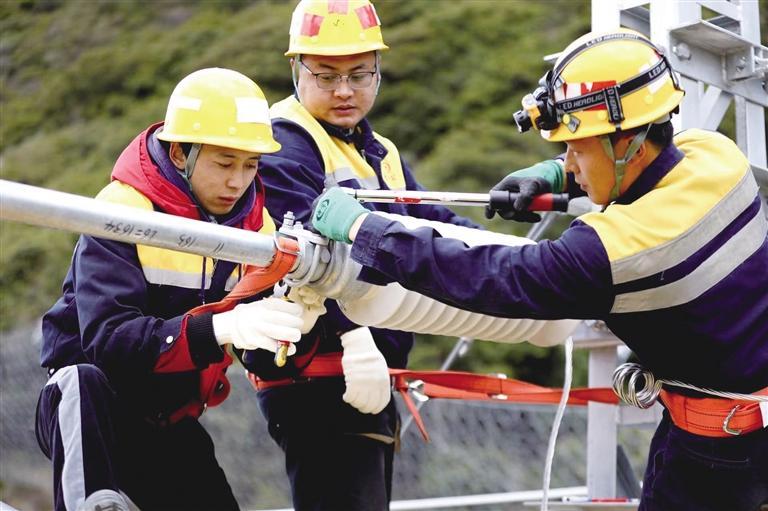 “高空作業(yè),大家把安全帽戴好!”彭江江不時(shí)提醒道。王偉點(diǎn)頭示意回應(yīng)工長(zhǎng)彭江江,隨后輕車(chē)熟路地將安全帶系在斜腕臂上,右手緊緊抓住上方的腕臂,右腳跨上懸空的定位管,左腳一蹬,穩(wěn)穩(wěn)地站在了斜腕臂上。工友蔣瀟和次仁加布也嫻熟地爬了上來(lái),他們動(dòng)作靈活協(xié)調(diào),身手敏捷矯健,整個(gè)過(guò)程連貫一通,無(wú)一點(diǎn)拖泥帶水。