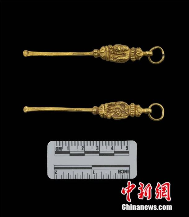 西藏自治區(qū)拉薩市當(dāng)雄縣當(dāng)曲卡鎮(zhèn),當(dāng)雄墓地出土的雄獅鳥(niǎo)紋金耳勺。國(guó)家文物局供圖