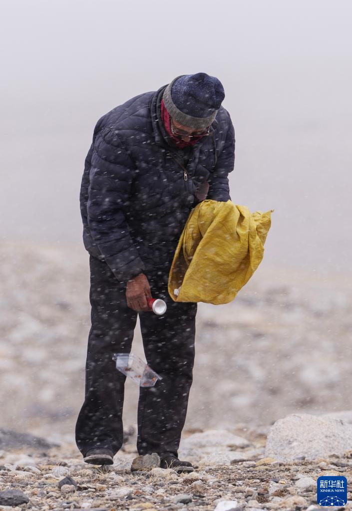 5月31日,乃乃老人在杰瑪央宗冰川山口附近撿拾垃圾。新華社記者 邵澤東 攝
