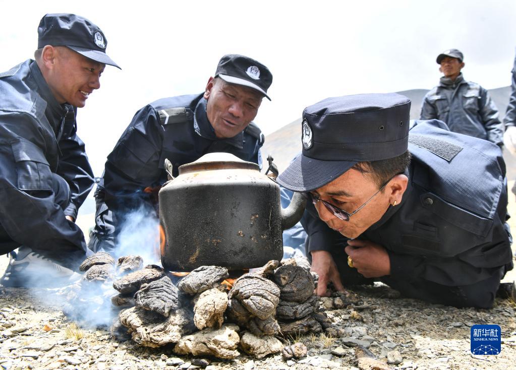 護邊聯(lián)防隊隊員在一塊空地上點燃牛糞,準(zhǔn)備午餐(6月2日攝)。新華社記者 晉美多吉 攝