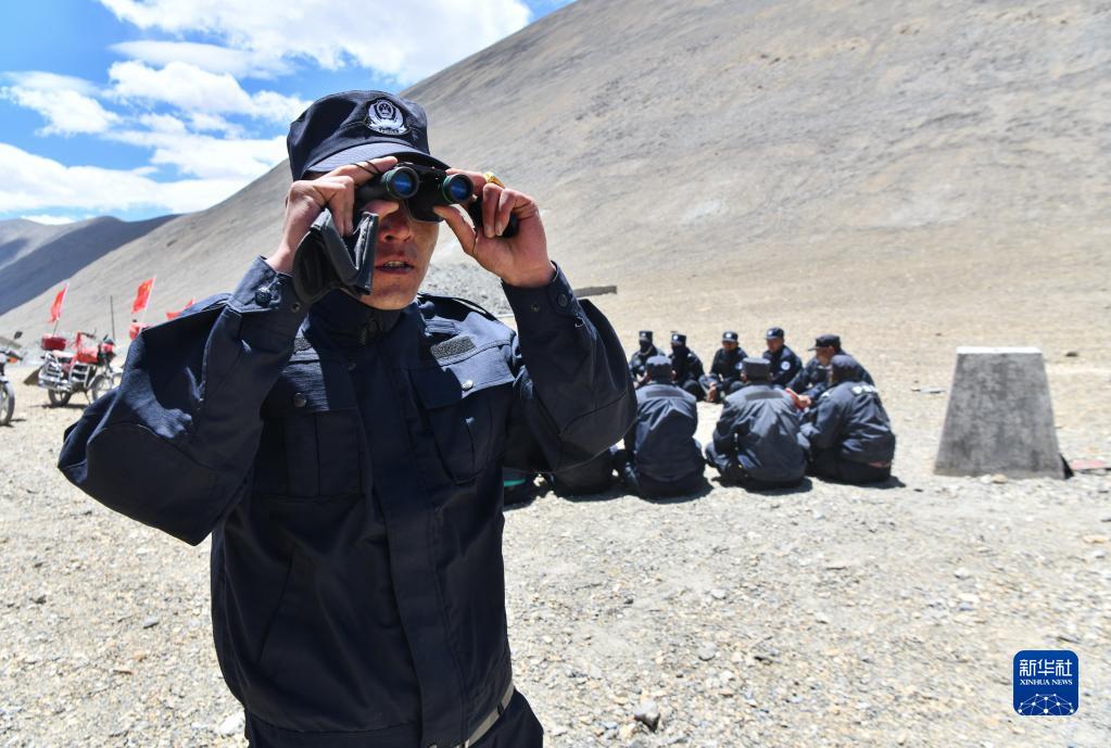 6月2日,在33號界樁處,一名護邊聯(lián)防隊隊員使用望遠(yuǎn)鏡巡查。新華社記者 晉美多吉 攝
